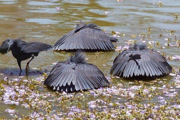 Semasa memburu ikan kecil di perairan cetek, burung hitam legam ini mengepakkan sayapnya seperti payung berbulu, mencipta tompok teduh yang menarik perhatian ikan mencari perlindungan.