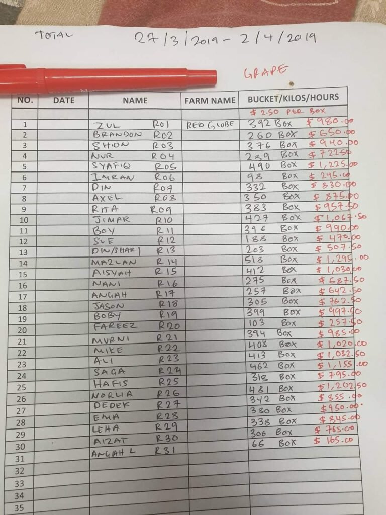 Upah Kutip buah anggur sekitar AUD20-AUD 25 perjam. Jika bekerja 8jam maka purata pendapatan harian AUD200.
