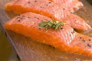 Walau bagaimanapun, salmon yang diternak di ladang sering diberi makan dengan pelet yang mengandungi tepung ikan yang diperbuat daripada ikan bilis, sardin, makarel, herring dan ikan kecil lain.