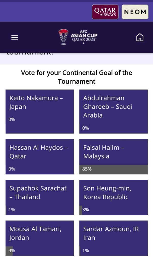 AFC telah menyenaraikan jaringan Faisal Halim adalah antara lapan terhebat sepanjang temasya Piala Asia Qatar 2023.