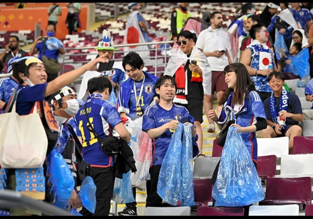 Kita dapat lihat di Kejohanan Bolasepak Piala Dunia penyokong pasukan Jepun mengutip sampah sarap dalam stadium sebaik tamat perlawanan.