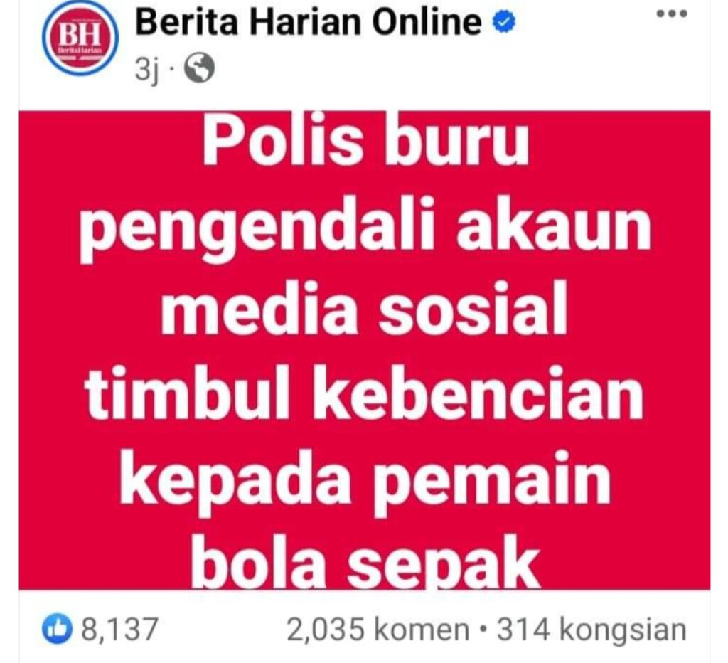 Polis DiRaja Malaysia sedang mengesan pemilik akaun media sosial yang dipercayai menghasut menimbulkan kebencian terhadap pemain bola sepak kebangsaan.