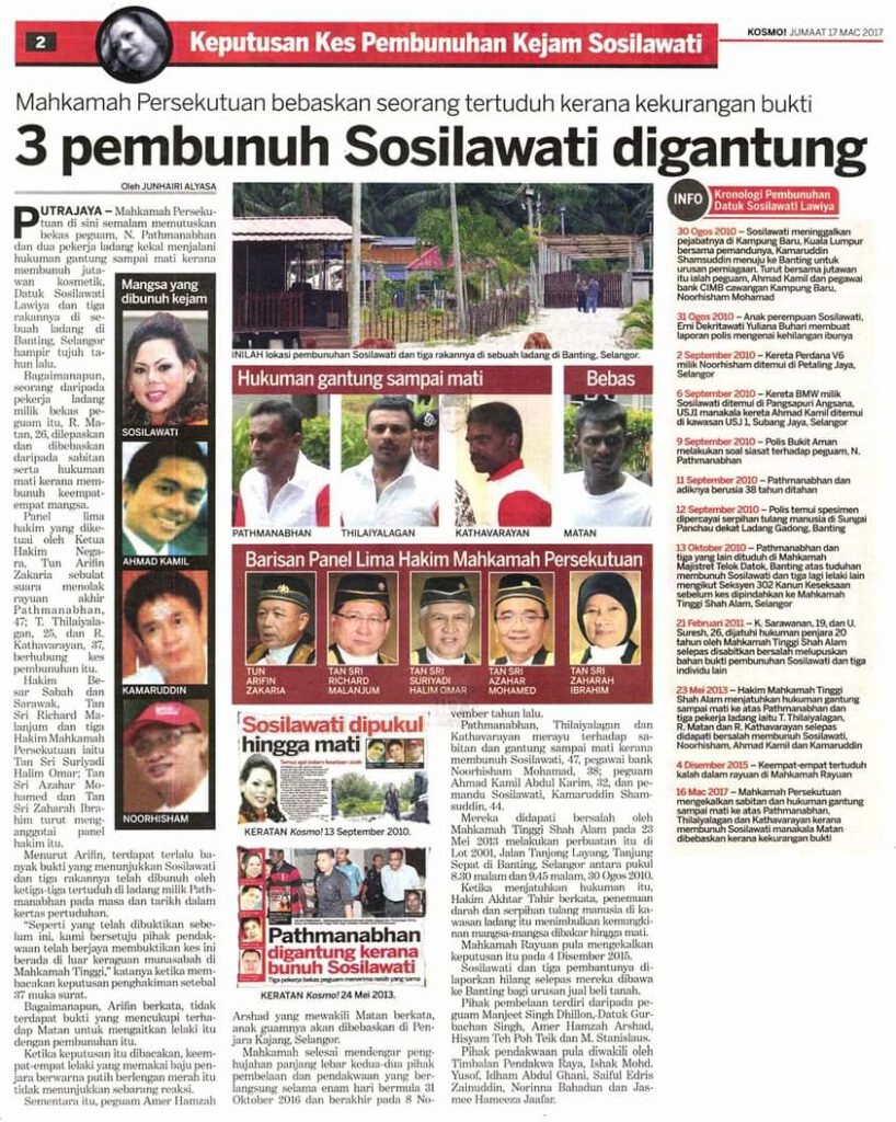 Pada 16 Mac 2017, Mahkamah Persekutuan memutuskan bekas peguam, N. Pathmanabhan dan dua pekerja ladang kekal menjalani hukuman gantung sampai kerana membunuh jutawan komestik, Datuk Sosilawati Lawiya dan tiga rakannya di sebuah ladang di Banting Selangor.