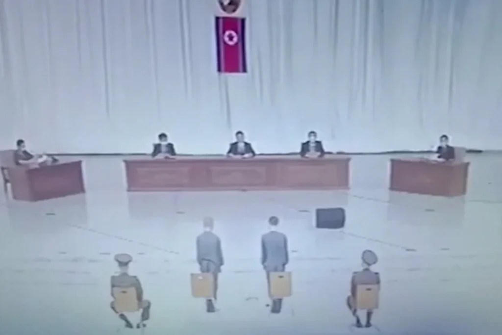 Kedua-dua remaja berusia 16 tahun, kelihatan diapit oleh dua orang dewasa berpakaian seragam gaya tentera, berdiri menghadap lima orang dewasa lagi seolah-olah seperti hakim dan Pendakwa. Tuduhan dibacakan dengan menamakan dua remaja itu dan membaca tuduhan tangkapan kerana kesalahan menonton dan mengedarkan rakaman video rejim boneka.