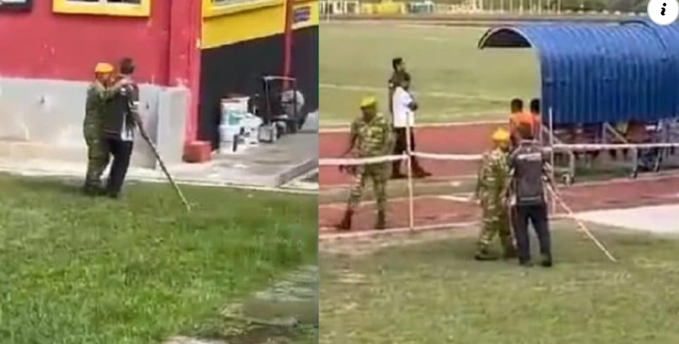 Anggota RELA kemudian menenangkan bapa berkenaan sebelum dia bersama anaknya berlalu pergi meninggalkan padang perlawanan.