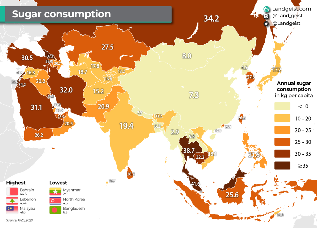 Berapa banyak gula yang digunakan oleh orang di Asia?