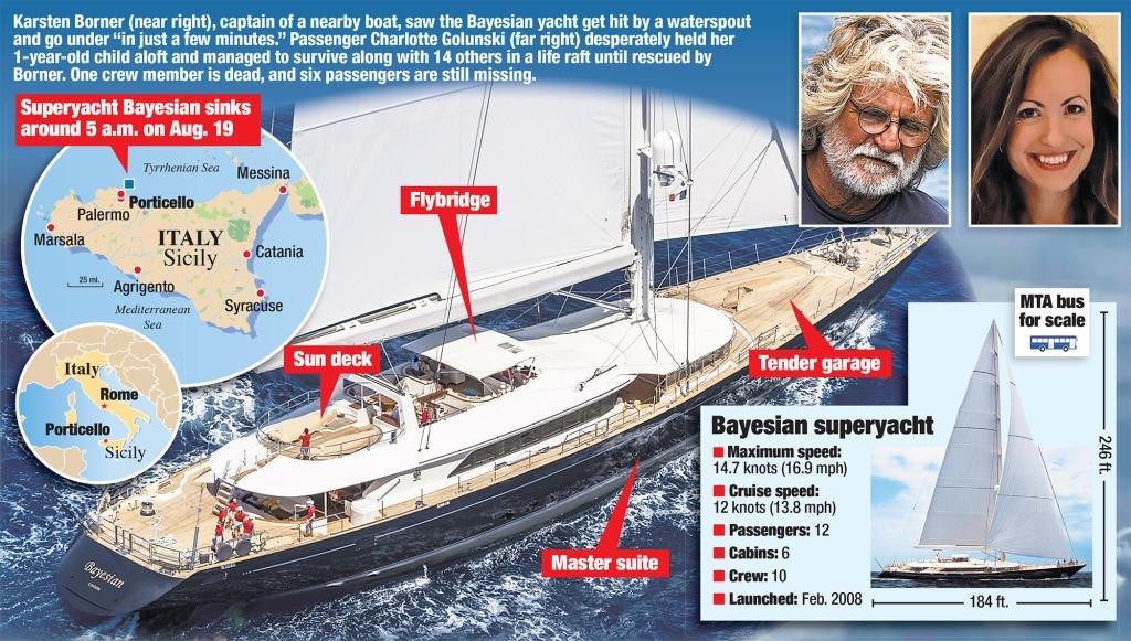 Kapal layar Bayesian sepanjang 56 meter itu tenggelam dengan 22 orang berada di kapal selepas terkena pukulan ribut pada awal pagi Isnin 19 Ogos 2024.
