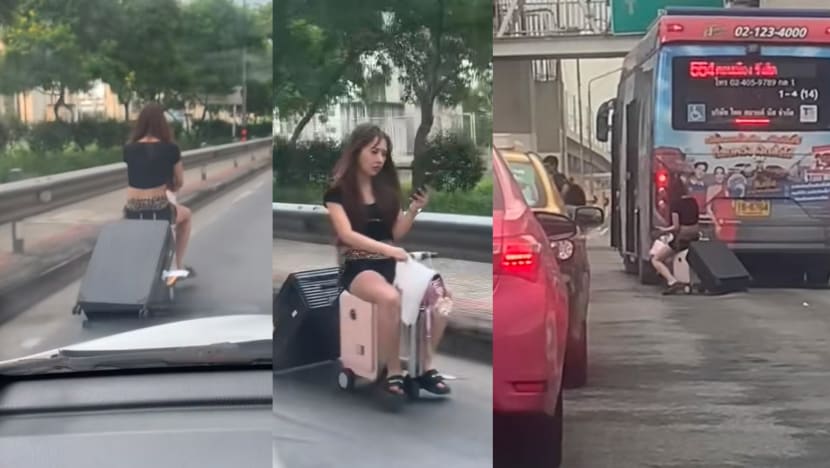 Klip, dirakam dan dikongsi oleh seorang penumpang di dalam kereta, melihat wanita itu menaiki bagasi bermotor merah jambu di jalan raya menuju ke Lapangan Terbang Antarabangsa Don Mueang.