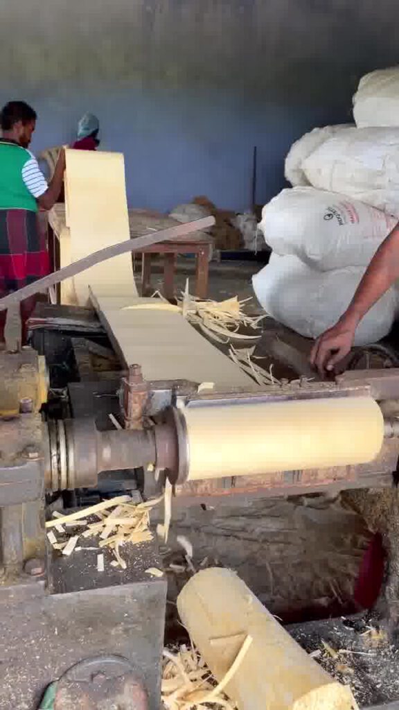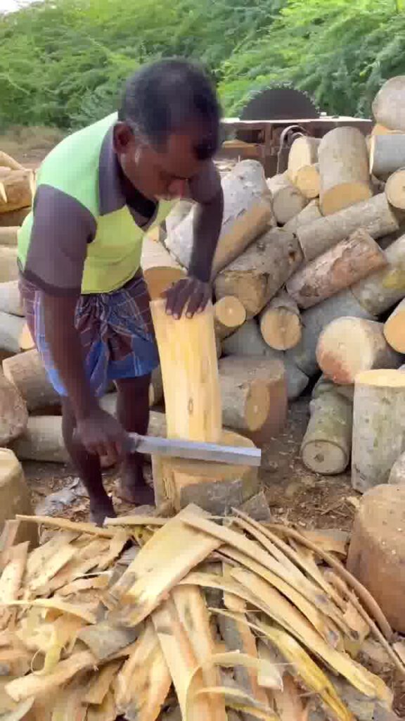 Langkah 1: Pemotongan Kayu: Di perkampungan pedalaman, para pekerja seperti yang dapat dilihat dalam gambar, menjalankan kerja memotong kayu secara manual. Batang kayu kemudian dipotong kepada kepingan yang nipis. Setiap kepingan kayu tersebut kemudiannya dibawa ke mesin untuk menghasilkan batang mancis.