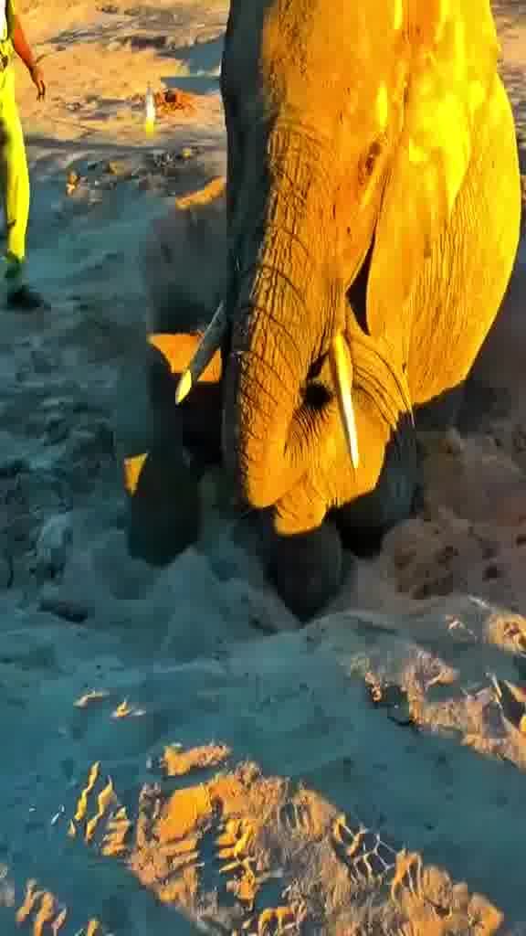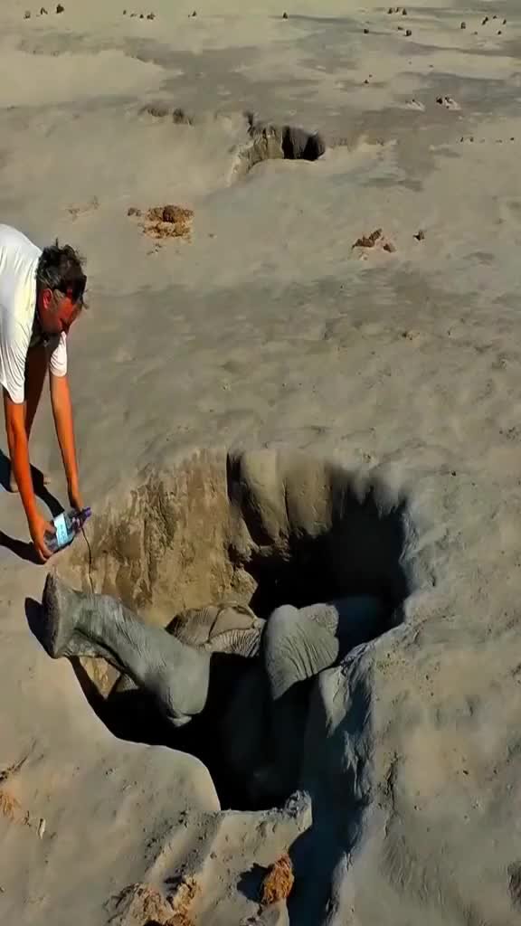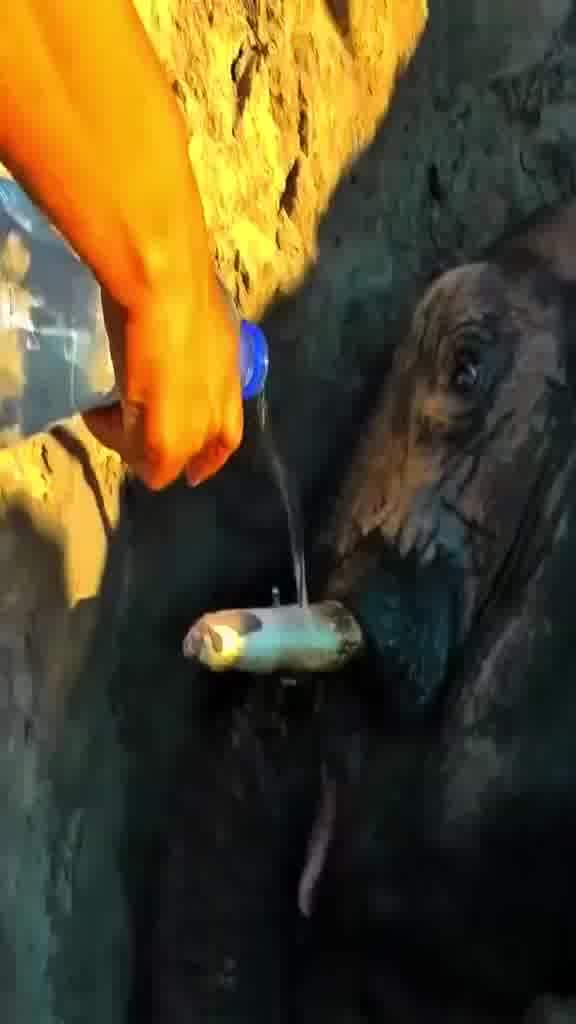 1. Memberi Air Kepada Anak Gajah: Gambar pertama menunjukkan seorang anggota penyelamat menuang air ke atas mulut anak gajah yang tersepit. Tindakan ini bertujuan untuk memastikan haiwan tersebut tidak kehausan, terutamanya ketika berada dalam keadaan terperangkap di bawah panas matahari dan tanah yang kering.