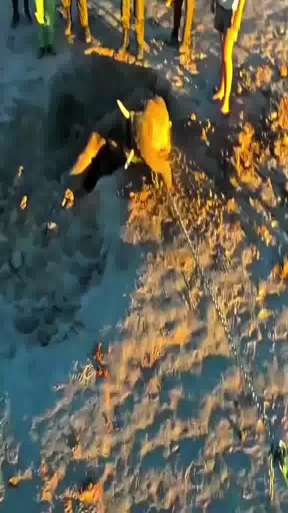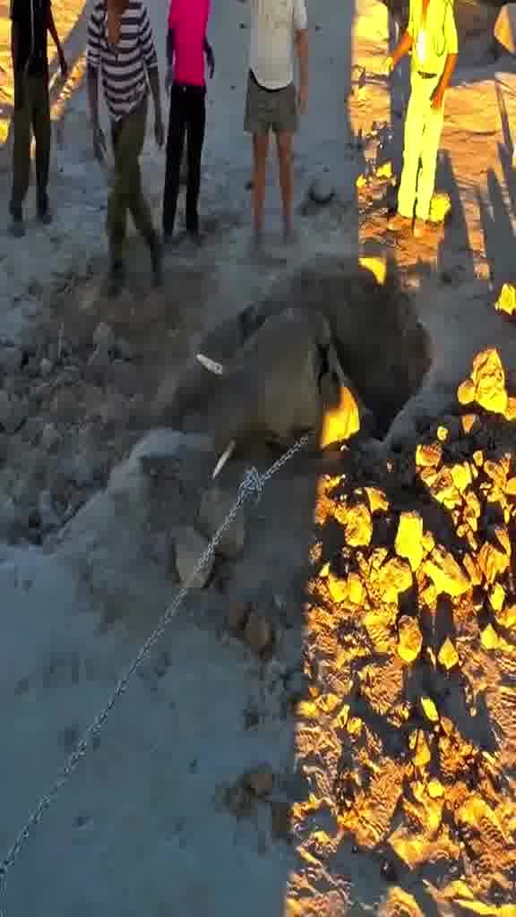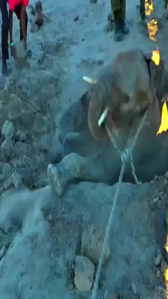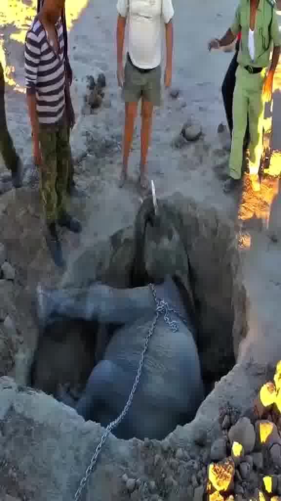 Dalam gambar-gambar berikutnya, dapat dilihat penyelamat bekerjasama dengan menggunakan tali, rantai, dan kenderaan berat bagi menarik haiwan yang malang tersebut keluar dari lubang yang dalam.