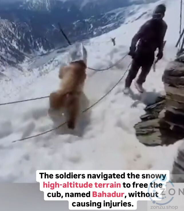 Video tersebut menunjukkan beberapa orang tentera menggunakan tali menarik anak beruang yang dinamakan Bahadur dalam salji tebal kedalam kem.  Dengan penuh kesabaran, mereka menggunakan alat pemotong untuk membebaskannya daripada tin yang melekat di lehernya, memastikan tidak ada kecederaan yang berlaku.