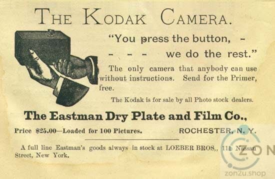 George Eastman, seorang peminat fotografi, merasa frustrasi dengan peralatan fotografi yang rumit dan mahal pada zamannya. Dengan tekad untuk menjadikan fotografi mudah diakses oleh orang biasa, Eastman mencipta mesin salutan plat kering dan mula menjual plat fotografi. Pada tahun 1888, beliau memperkenalkan kamera Kodak, sebuah kamera kotak mudah yang datang dengan filem 100 pendedahan. Slogan “Anda tekan butang, kami uruskan selebihnya” menggambarkan kemudahan penggunaan yang menjadikan kamera Kodak sangat popular.