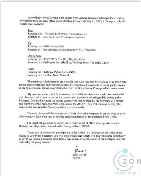 Pada 8 Februari 2025, Jabatan Pertahanan Amerika Syarikat mengumumkan program rotasi media tahunan yang menyaksikan perubahan signifikan dalam penempatan ruang pejabat di Koridor Wartawan Pentagon. Langkah ini bertujuan untuk memberikan akses kepada organisasi media yang sebelum ini tidak berpeluang beroperasi dari dalam Pentagon.