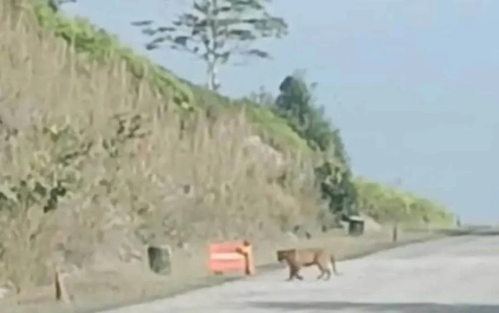 Video berdurasi lebih satu minit menunjukkan harimau kira-kira 200 kilogram itu keluar dari belukar di kanan jalan sebelum melintas ke kawasan semak berbukit. Kejadian berlaku pada waktu siang.