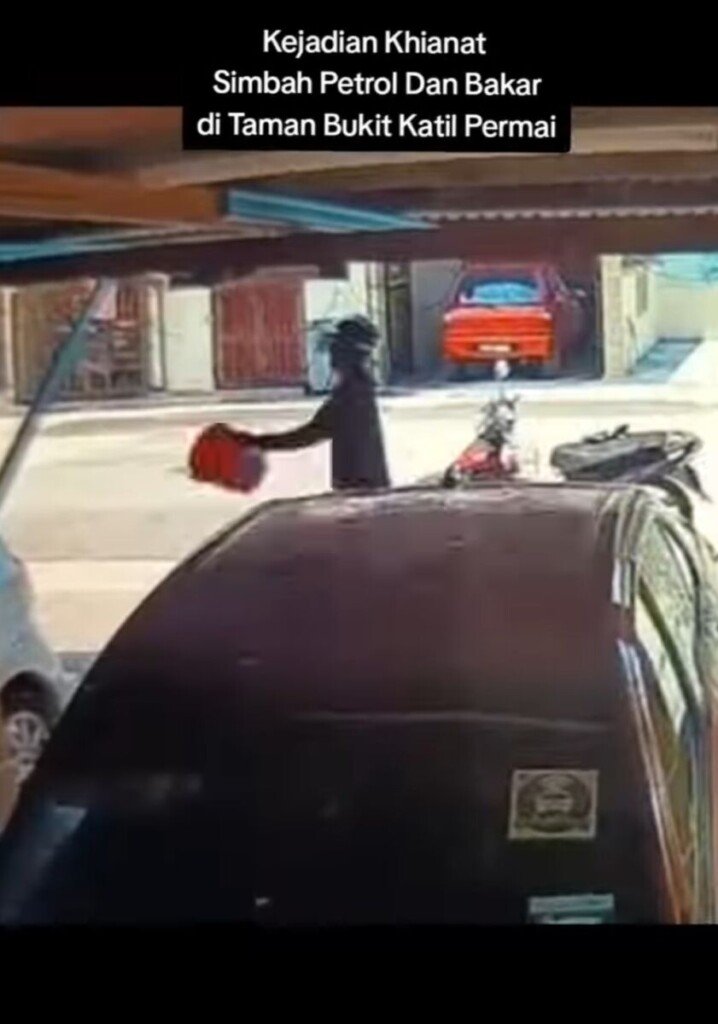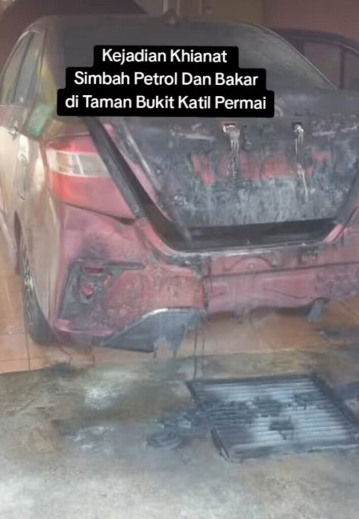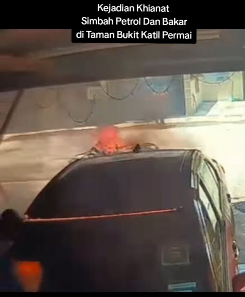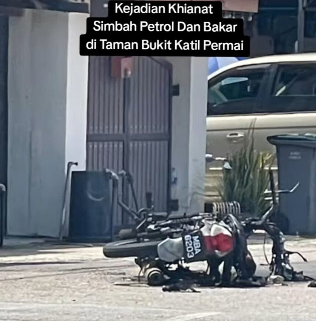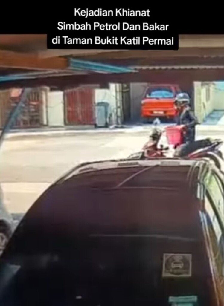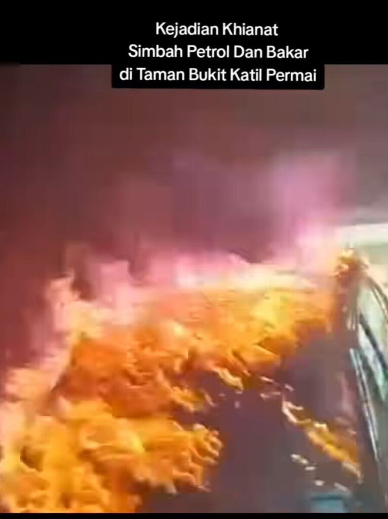 Kejadian khianat berlaku di Taman Bukit Katil Permai, Melaka apabila dua buah kereta disimbah petrol lalu dibakar. Api turut merebak ke motosikal suspek yang ditinggalkan di lokasi. Kes disiasat sebagai khianat dengan api.
