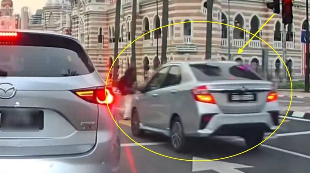 VIDEO TULAR di media sosial memaparkan kereta e-hailing melanggar lampu merah dan hampir melanggar pejalan kaki wanita di Jalan Hishamudin berhampiran Dataran Merdeka.