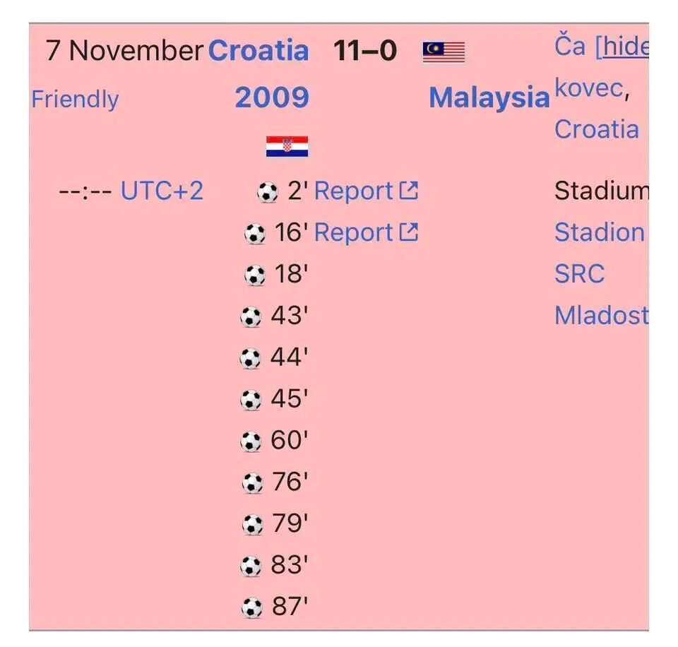 - Beberapa percubaan Crotia menewaskan tiga pertahanan Malaysia dalam kotak penalti.