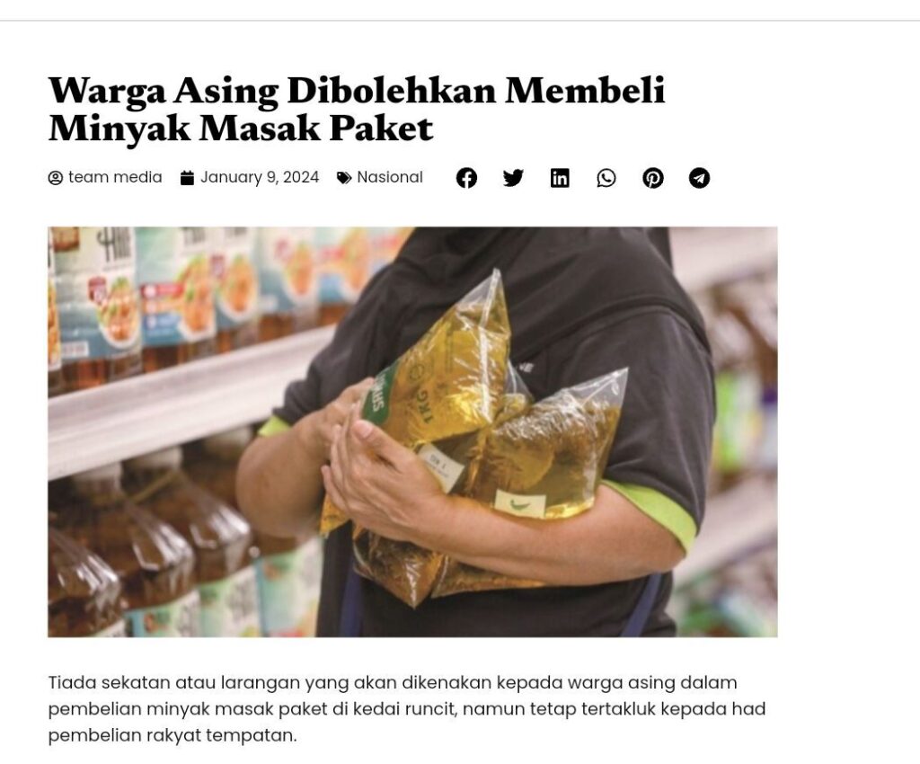 Mulai 1 Mac 2026, lebih 3 juta warga asing tidak lagi dibenarkan membeli minyak masak peket RM2.50. Inilah langkah berani KDN & KPDN demi hak rakyat Malaysia.