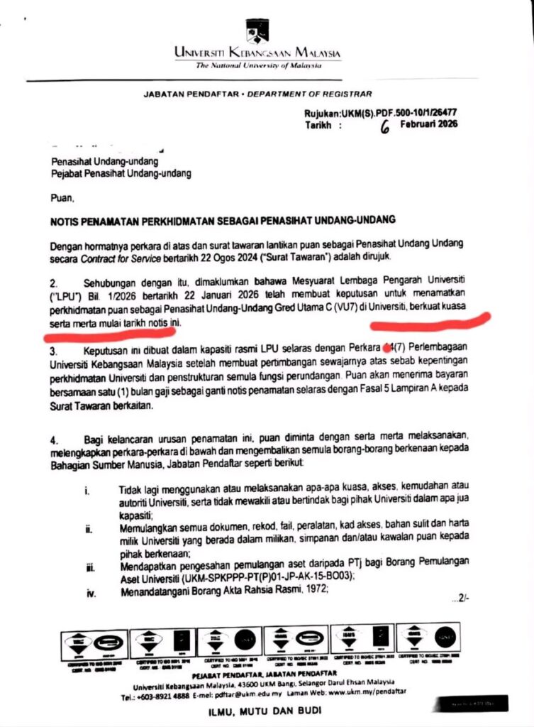 Antara kes yang menarik perhatian ialah pemberhentian Penasihat Undang-Undang (PUU) UKM. Dakwaan menyatakan Pengerusi Lembaga Pengarah Universiti (LPU) hanya membuat remarks spontan dalam mesyuarat untuk memberhentikan beliau, tanpa sebab kukuh atau peluang membela diri. 🤔