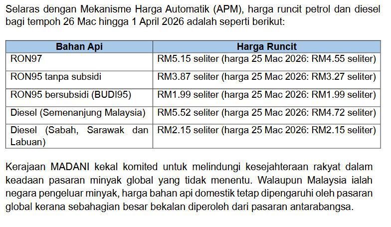 Ketegangan di Asia Barat melonjakkan harga minyak mentah dunia melebihi US$100 setong, memaksa pelarasan harga domestik bermula 26 Mac 2026.