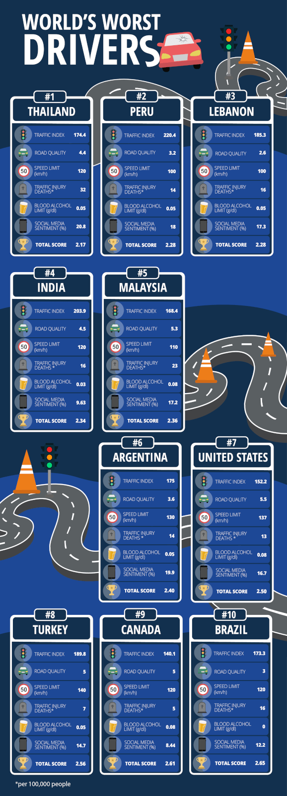 Thailand secara rasmi telah dipilih sebagai negara memiliki ramai pemandu paling tidak berhemah di dunia, yang menyebabkan jumlah kematian dan kecederaan serius tertinggi iaitu 32 bagi setiap 100,000 orang. Peru di tempat kedua dengan skor…