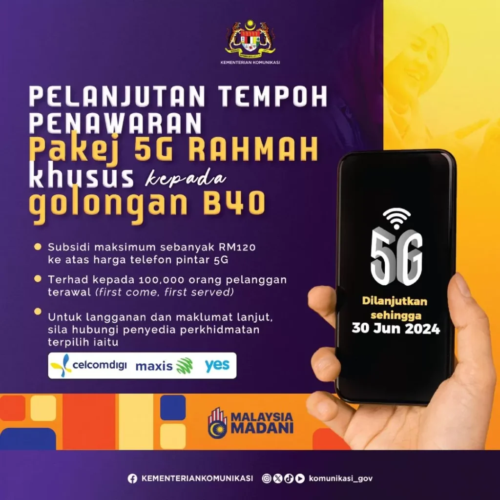 Hantar dan Sebar        Berita baik untuk golongan B40, Kementerian Komunikasi kini mengumumkan pelanjutan tempoh subsidi membeli telefon 5G Rahmah sehingga 30 Jun 2024. Sebelum ini, ia telah diperkenalkan pada bulan Ogos 2023 lepas, dalam usaha mengalakkan orang ramai mendapatkan peranti 5G pada harga diskaun. Subsidi ditawarkan sehingga RM120 untuk harga telefon pintar 5G, dan ia